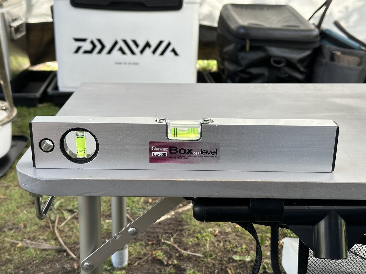 キャンプでは完全な平地はほとんどないことから、テーブル、七輪、焚火台など水平を保ちたい時に水平器を使う。