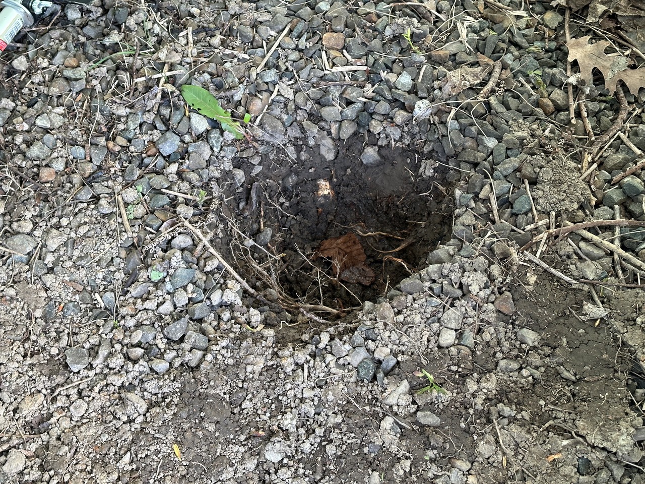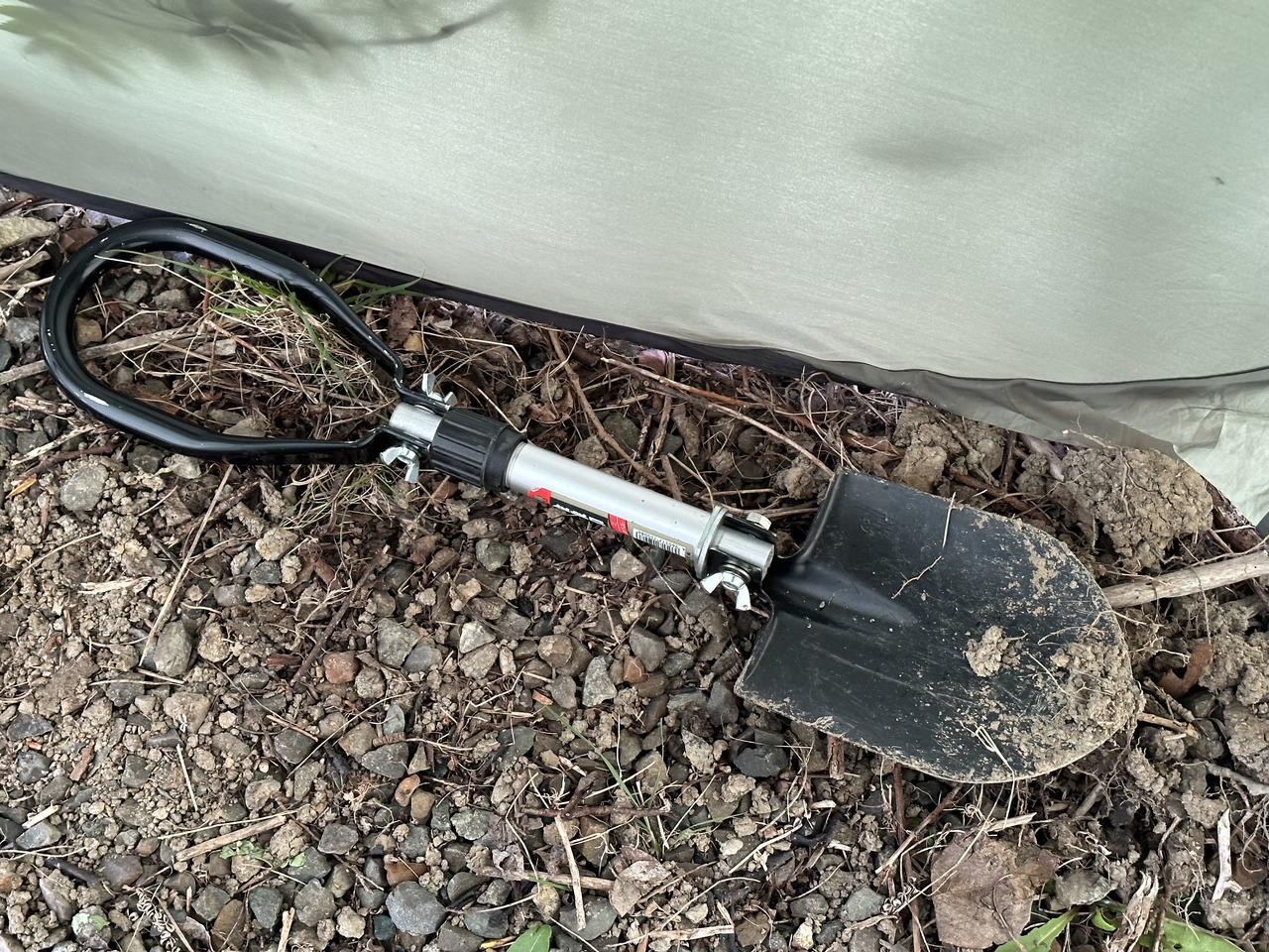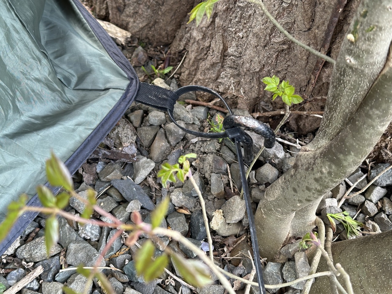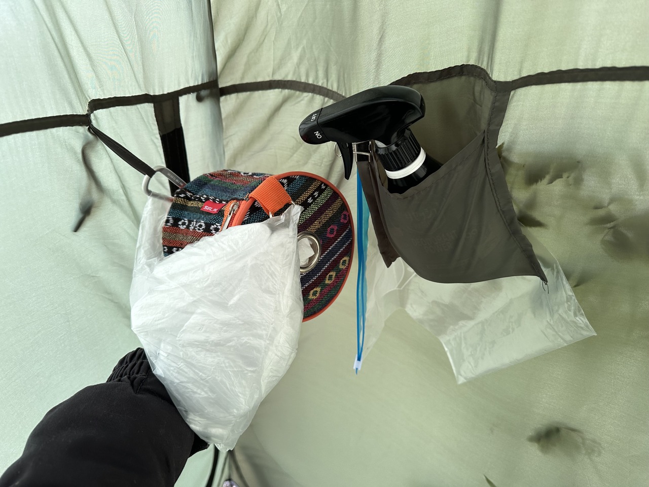 地面に穴を開けてます。持ち帰れるようなゴミ袋も備えつけてます。カスタマイズとしては、四つ角の生地が弱いので結束バンドでペグを打てるようにしてます。