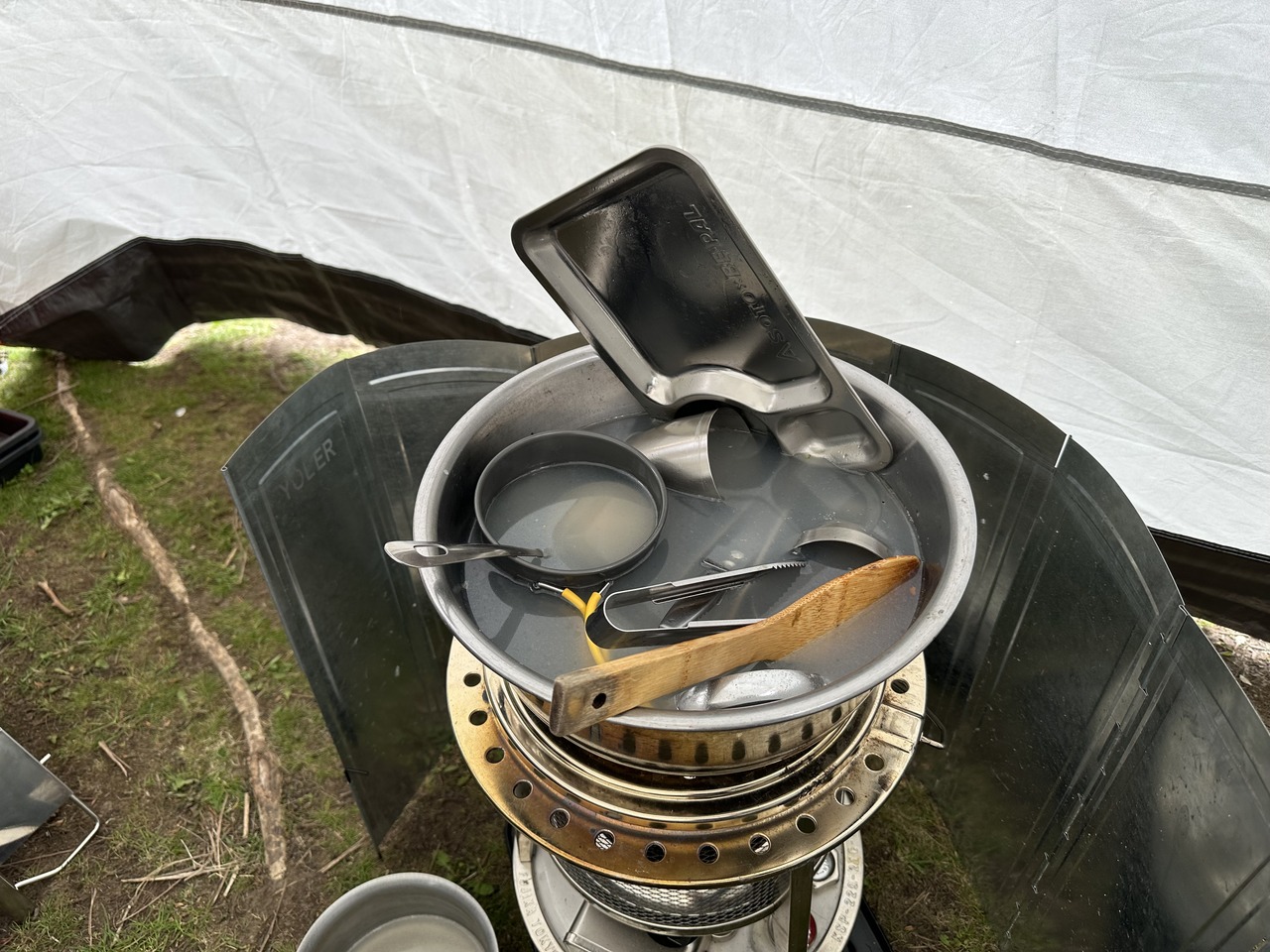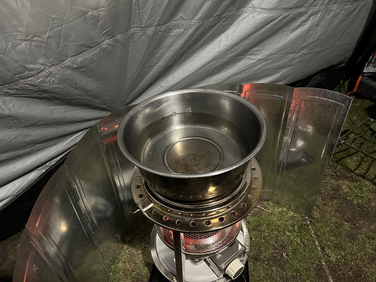 我が家では、ストーブとセットでタライを必ず持参している。温度を上げるためには湿度が大事と言うのはあまり歌わせていない。部屋の湿度を60%以上にすると暖かさが格段に変わるため、特に冬のキャンプでは湿度を上げることで効率の良い環境を保つことが出来るのである。