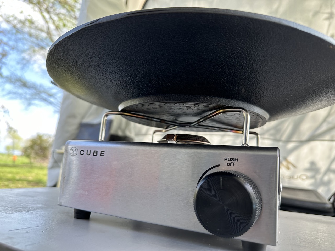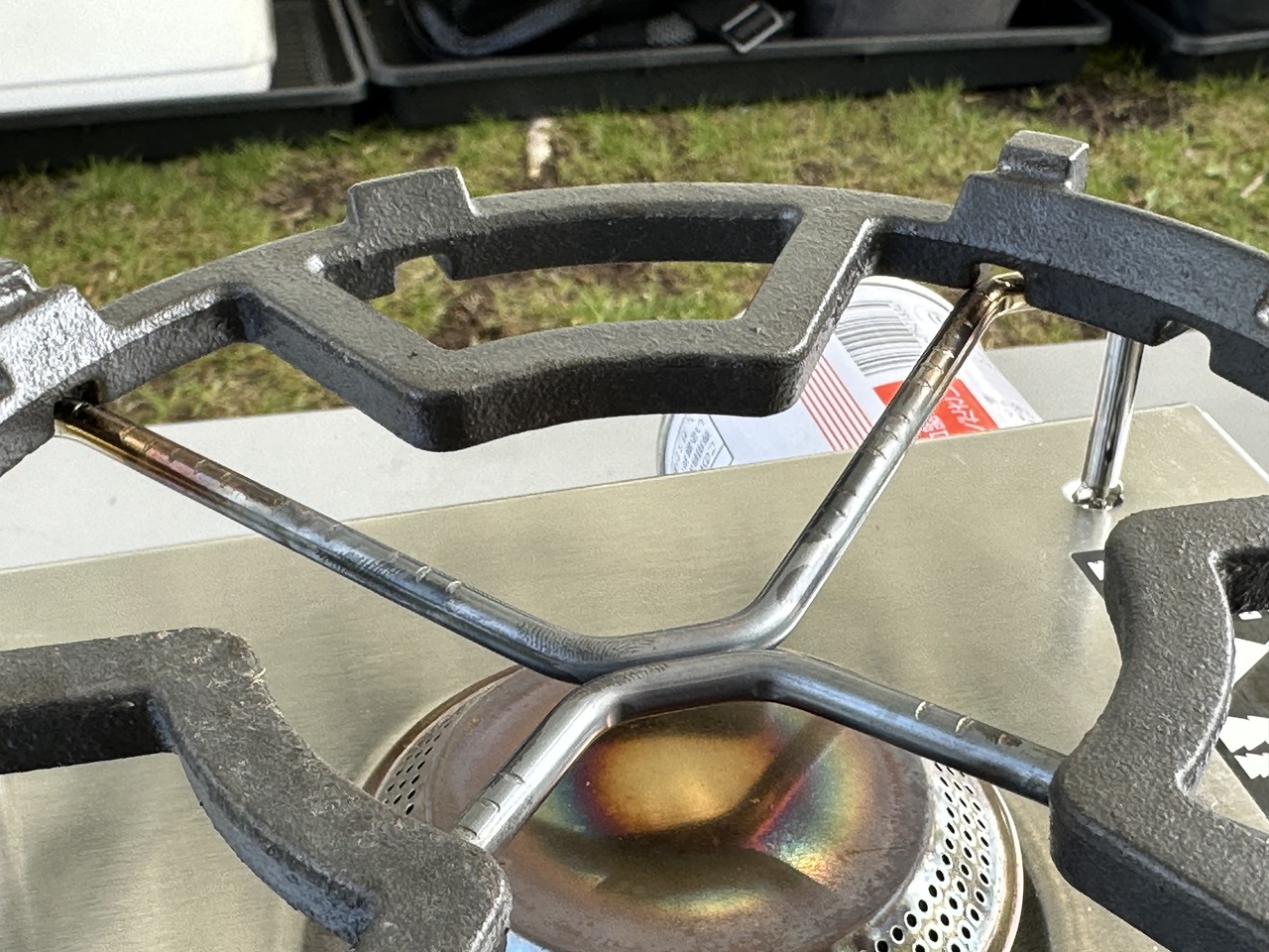 マルチグリドルの固定は若干の隙間が出来ますがズレることはありません。五徳に関しても複数のクボミがあり、カセットコンロによってはジャストフィットするものがあり、自宅で使っている二台のカセットコンロはどちらとも対応しました。
