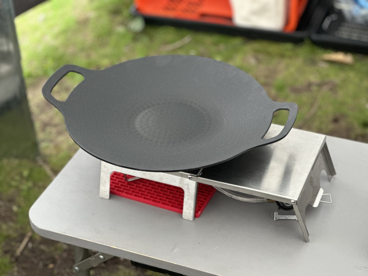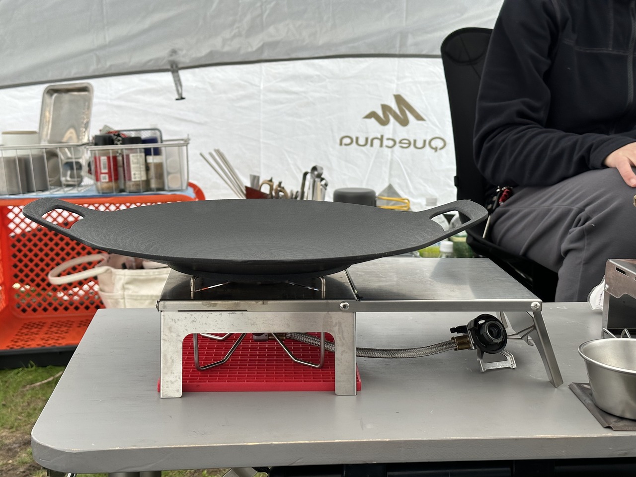 これからは鉄板は使わなくなるのではと思いましたが、マルチドグリルは焚火や炭などの直火はNG。また、ガシガシ切ったりすると表面にキズがつきテフロン加工が剥がれて焦げつきやすくなるデメリットがあります。